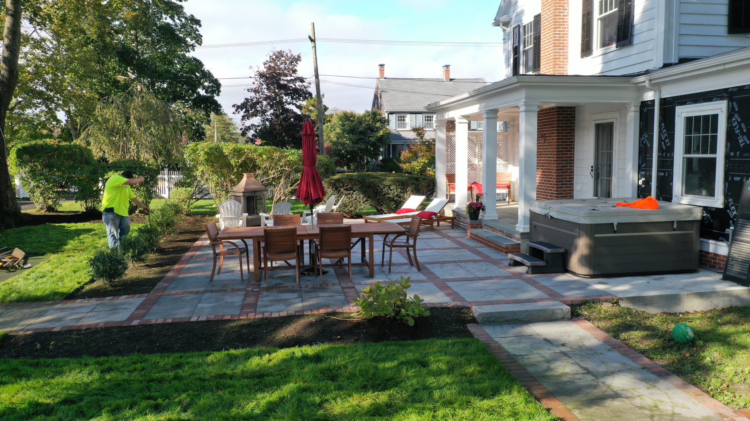 This project completed by our landscape construction team took place in the historic center of Fairhaven. The client wanted to repalce an exisiting walkway and add a patio around a new hot tub, as well as create an area to gather around the fire. We used a historical look and pattern to tie into the aesthetic of the neighborhood. Including bluesotne pavers and a classic brick border.